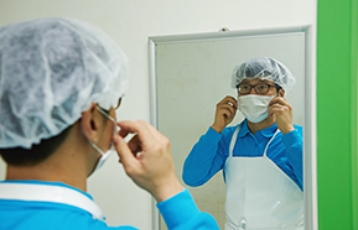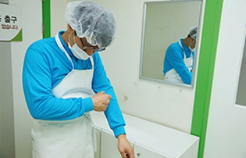 전신 거울 앞에 서서 관리기준에 적합한지 다시 한 번 위생복장을 점검합니다.