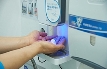 에어샤워기를 나온 후 출입문 옆에 비치되어 있는 살균소독액을 사용하여 손살균을 실시합니다.